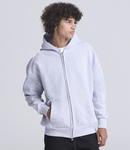 70% ringspun cotton/20% polyester/10% recycled polyester.* Cotton faced fabric. Brushed back fleece. Drop shoulder style. Oversized fit. Three panel double fabric hood. Full length two way zip. Front pouch pockets. Ribbed cuffs and hem. Twin needle stitching. Tear out label.